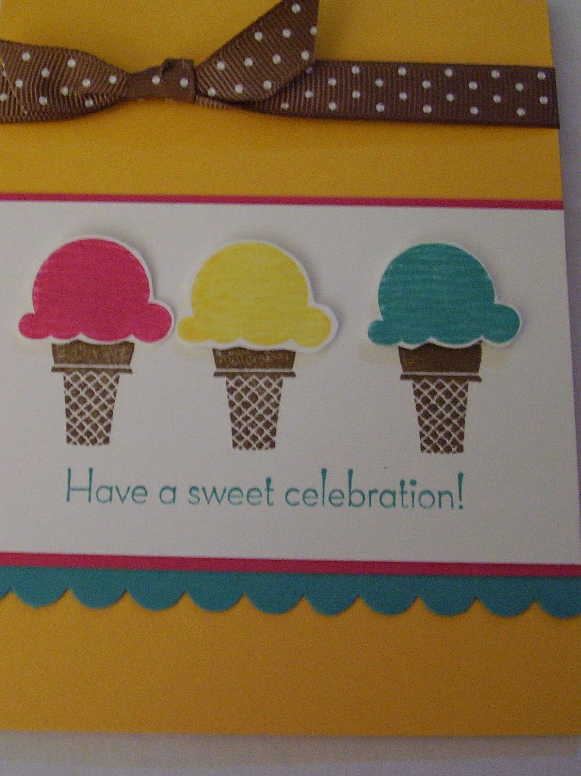 Check out this new stamp set from SU called "Sweet Scoops"! It's in the Summer Mini Catalog which starts May 1. This card was made using Crushed Curry, Melon Mambo, Bermuda Bay, Soft Suede, and Whisper White. I popped up the scoops using dimensionals and used the Scallop Edge Punch for the trim.