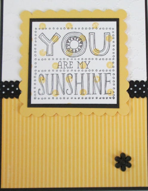 Couldn't we all use a little more "Sunshine"? This single stamp is only $5.95 and also fits perfectly on a 3" x 3" card. I stamped it in Basic Black and then again in Daffodil Delight with the "Distressed Dots" background stamp. I mounted it on Basic Black and then again on Daffodil Delight made with the Scallop Squares Duo Die. The top was made using the Cloudy Day Embossing Folder and the bottom with the Color Collection Designer Series Paper Stacks. Last, I added a Flower Brad and a 1/2" Scallop Dots Ribbon.