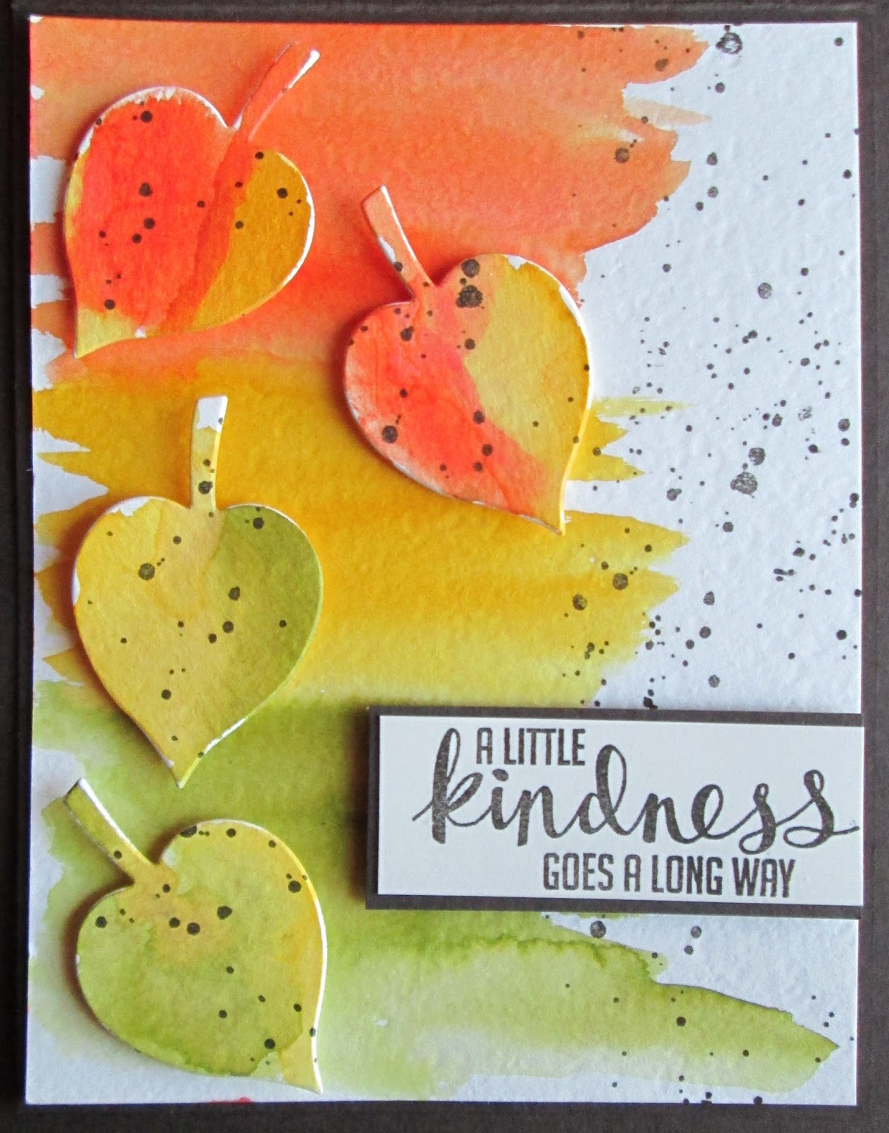 I cut out these leaves using the Leaflets Framelits and Watercolor Paper. Then I used Tangerine Tango, Crushed Curry, and Old Olive ink pads with some Aqua Painters on the leaves and the background. The splatters are from "Gorgeous Grunge" and the words are from "Kinda Eclectic". Both were stamped in Early Espresso.