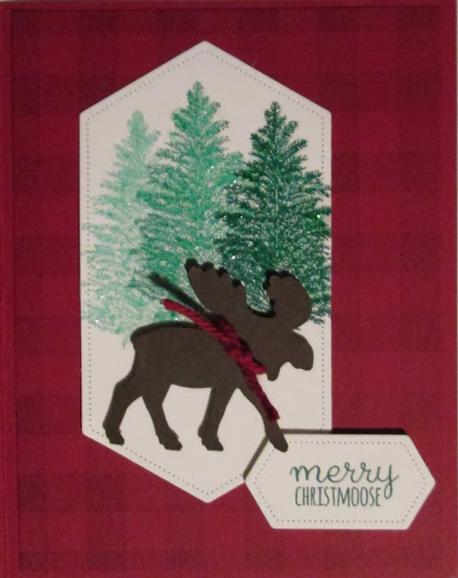 This cute little guy is from the "Merry Moose" set which also has a coordinating punch. I cut him out of Early Espresso card stock. The trees were stamped with Shaded Spruce ink and then stamped off to make lighter shades. I put some Shimmery Crystal Effects on the trees to give them a little bling and cut that piece and the words out with the Stitched Nested Labels Dies. I stamped the background with the Buffalo Check stamp with Cherry Cobbler ink on Cherry Cobbler card stock.