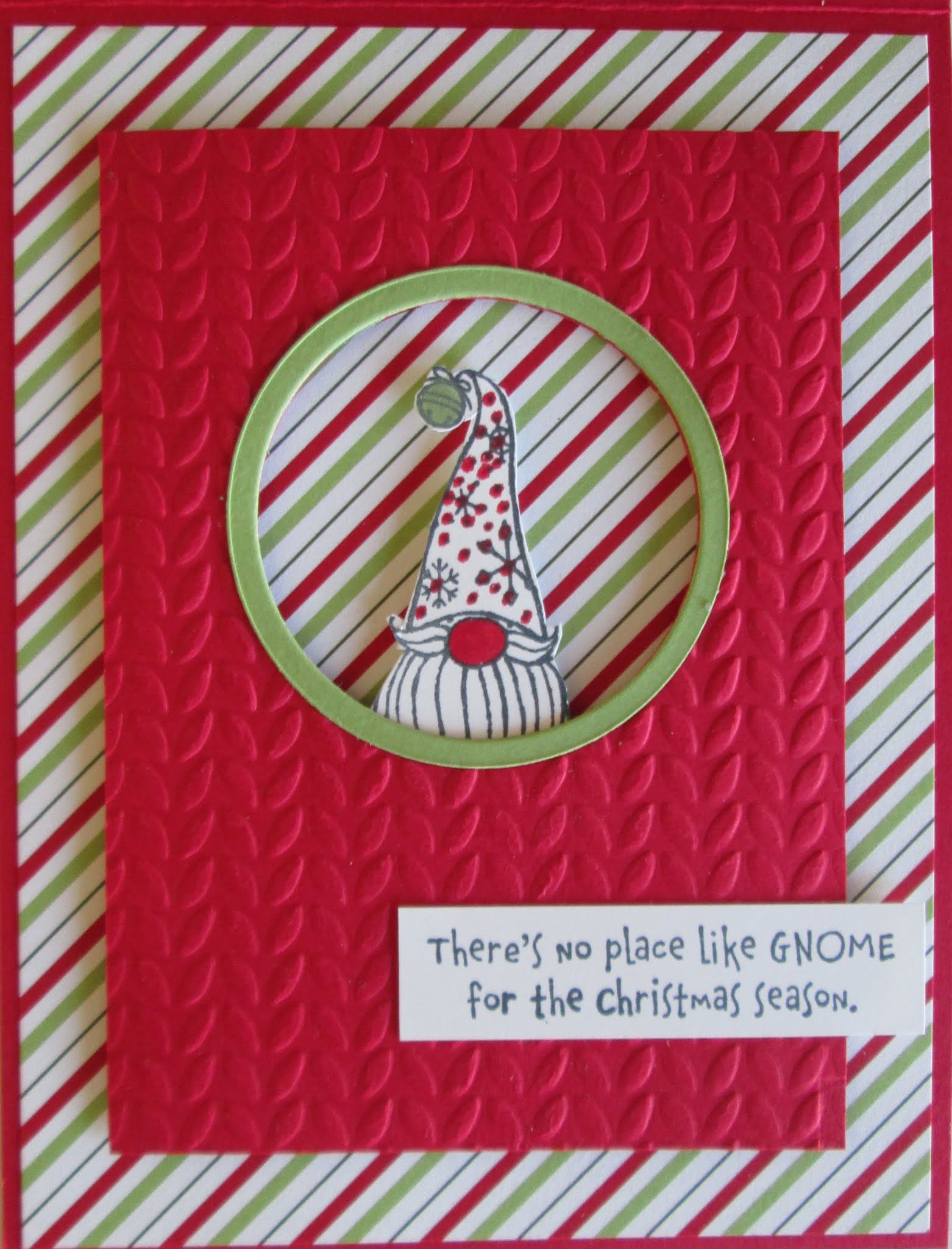 Here's another card from the "Gnome for the Holidays" set. I stamped everything in Real Red and then embossed it with the Winter Snow Embossing Folder. I used the Stitched So Sweetly Dies to make the frame around the words. Last, I made a little bow with the Real Red Braided Linen Trim.