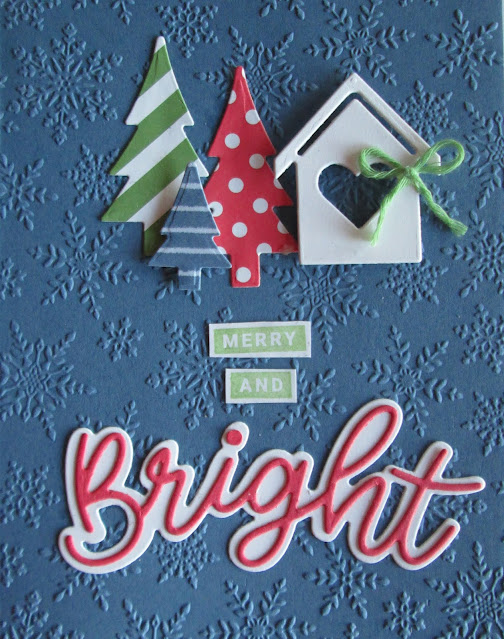This cutie card was made from the "Coming Home" set and coordinating Home Together Dies. I stamped some Trimming the Town DSP and then cut the trees out. I put a little snowflake DSP on top of the circle and then added the house to that. I used the Winter Snow Embossing Folder to make the background and layered some Snowflake Splendor Ribbon under that. The words were cut from the DSP and popped up on Dimensionals.